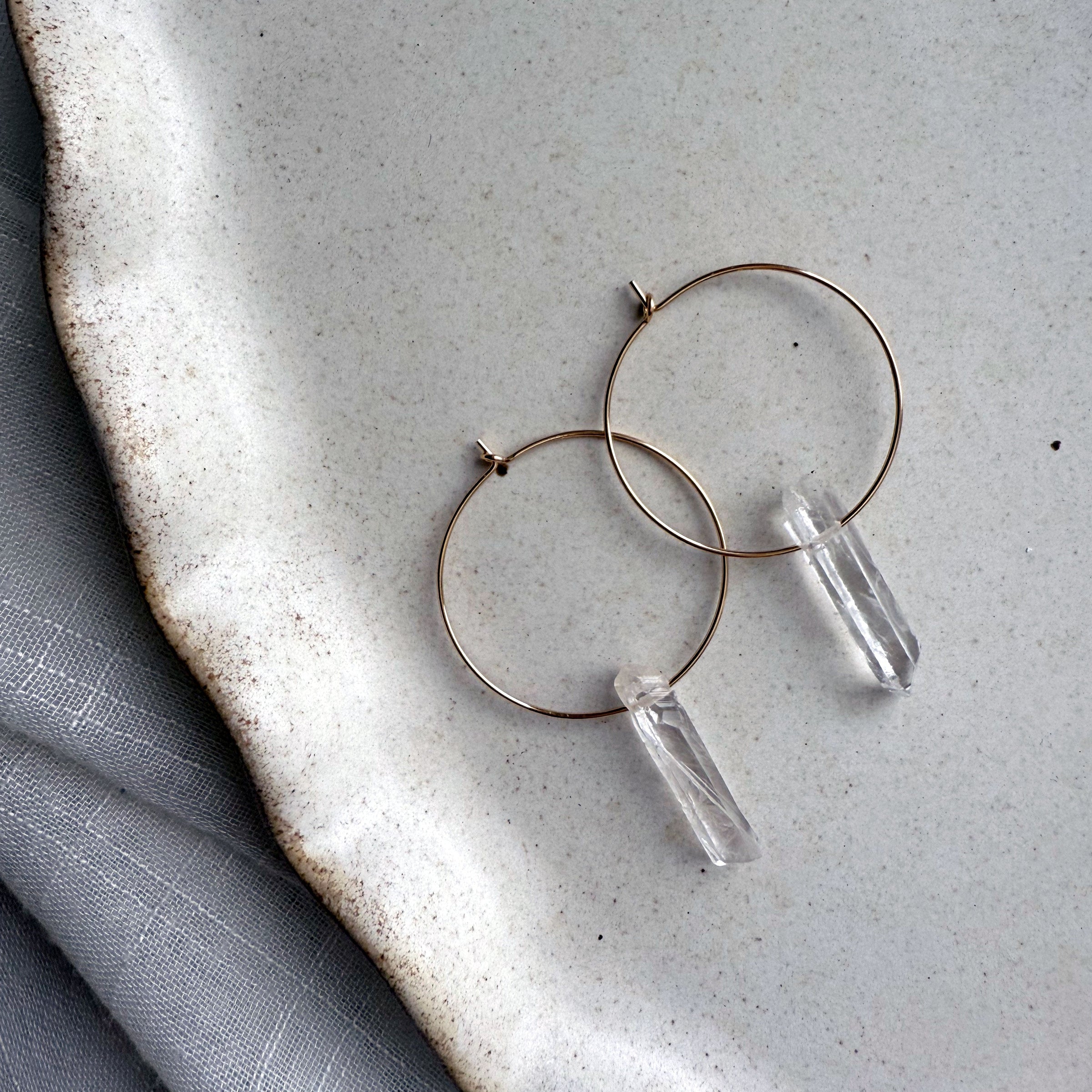 This pair of earrings is crafted with gold filled hoops and natural clear quartz tips. Gold filled jewelry is highly durable, hypoallergenic, and resistant to tarnish, making it perfect for everyday wear.